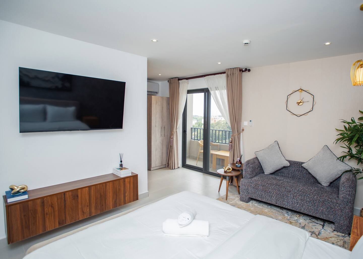 Step into a serene, elegant studio complete with a comfy queen bed, smart TV, high-speed WiFi, a fully equipped kitchenette, and a spotless bathroom with premium finishes.